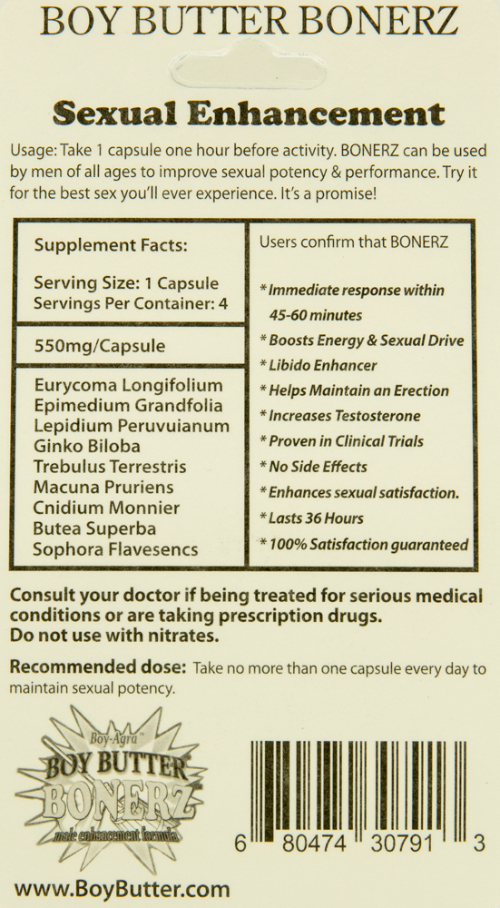 Even if you are enjoying a great sex life, try Boy Butter Bonerz – you will not believe the difference. The 36 hour formula stimulates blood flow for larger erections. Get immediate response within 45-60 minutes for total satisfaction.